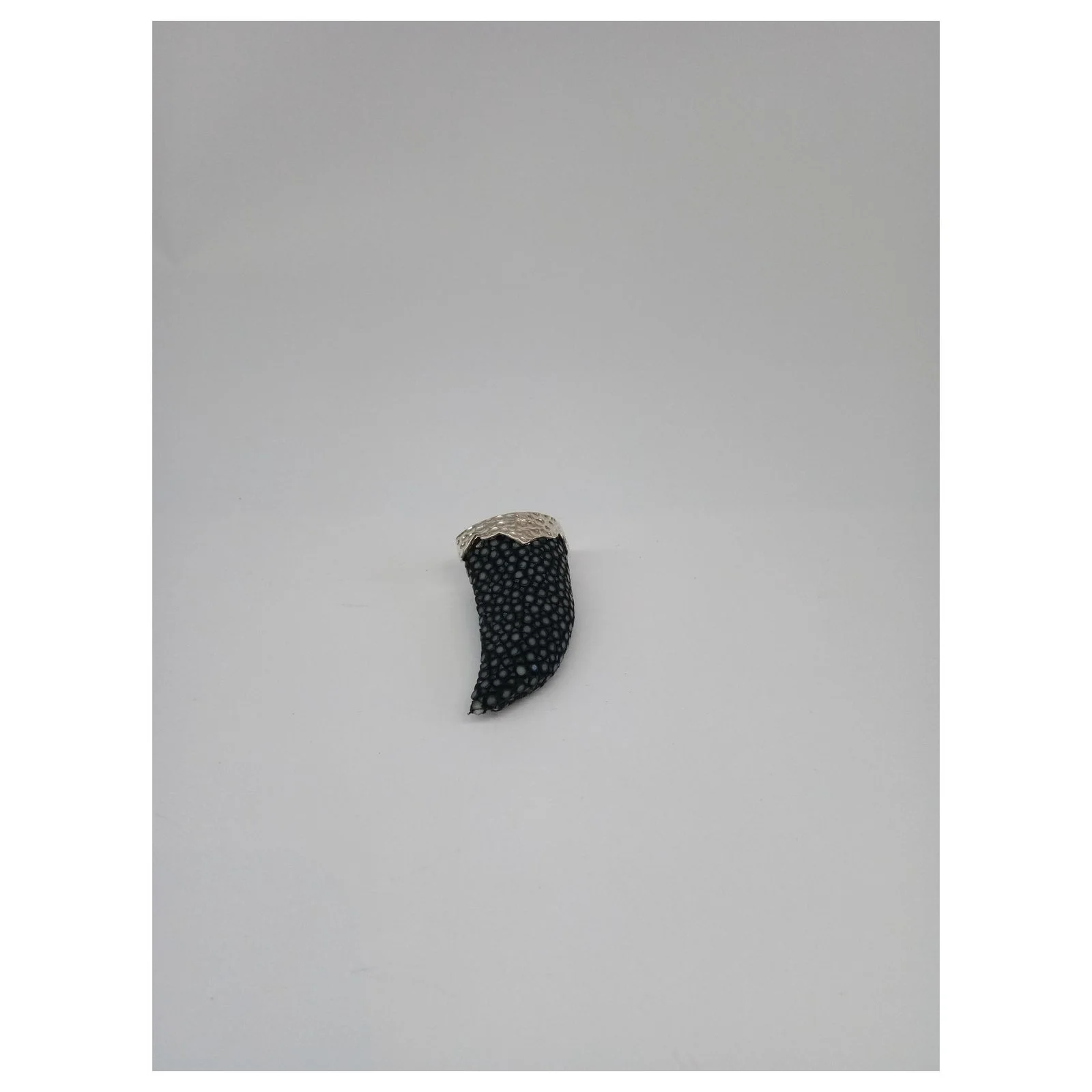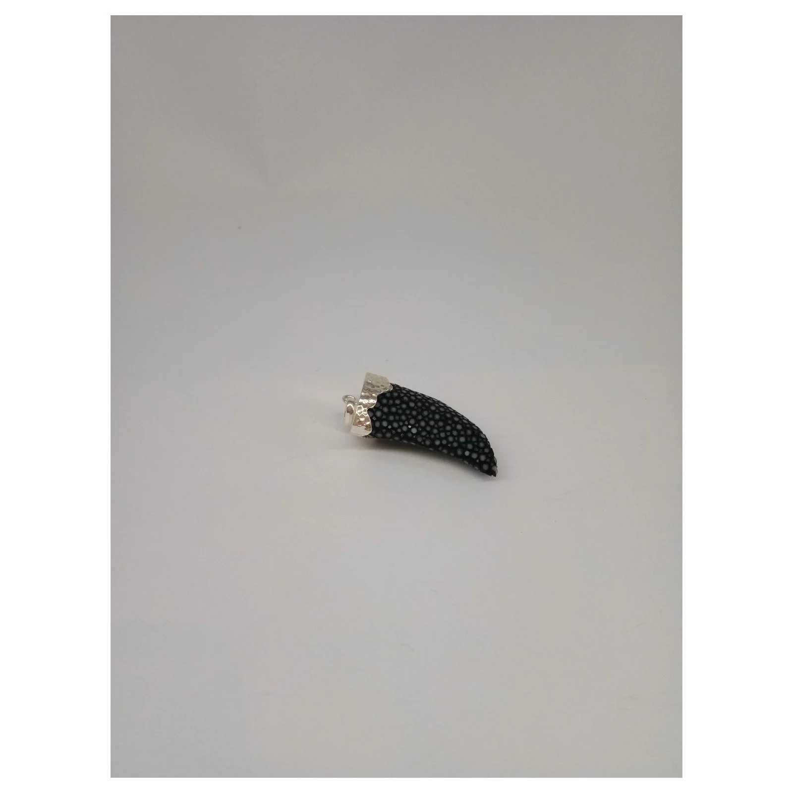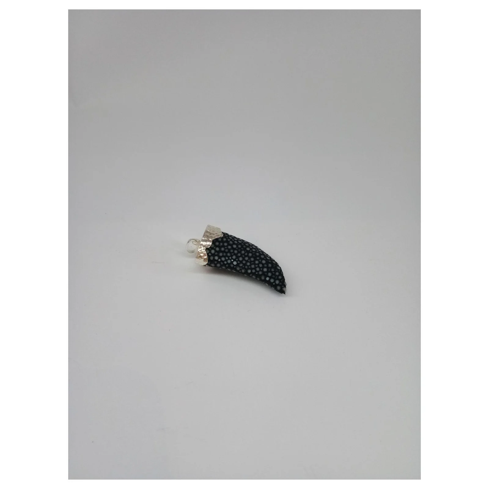 Magnifique charme / pendentif en cuir de galuchat bleu marine; véritable cuir de galuchat poli (cuir exotique de raie de mer, relatif du requin); placage de laiton et d’argent.