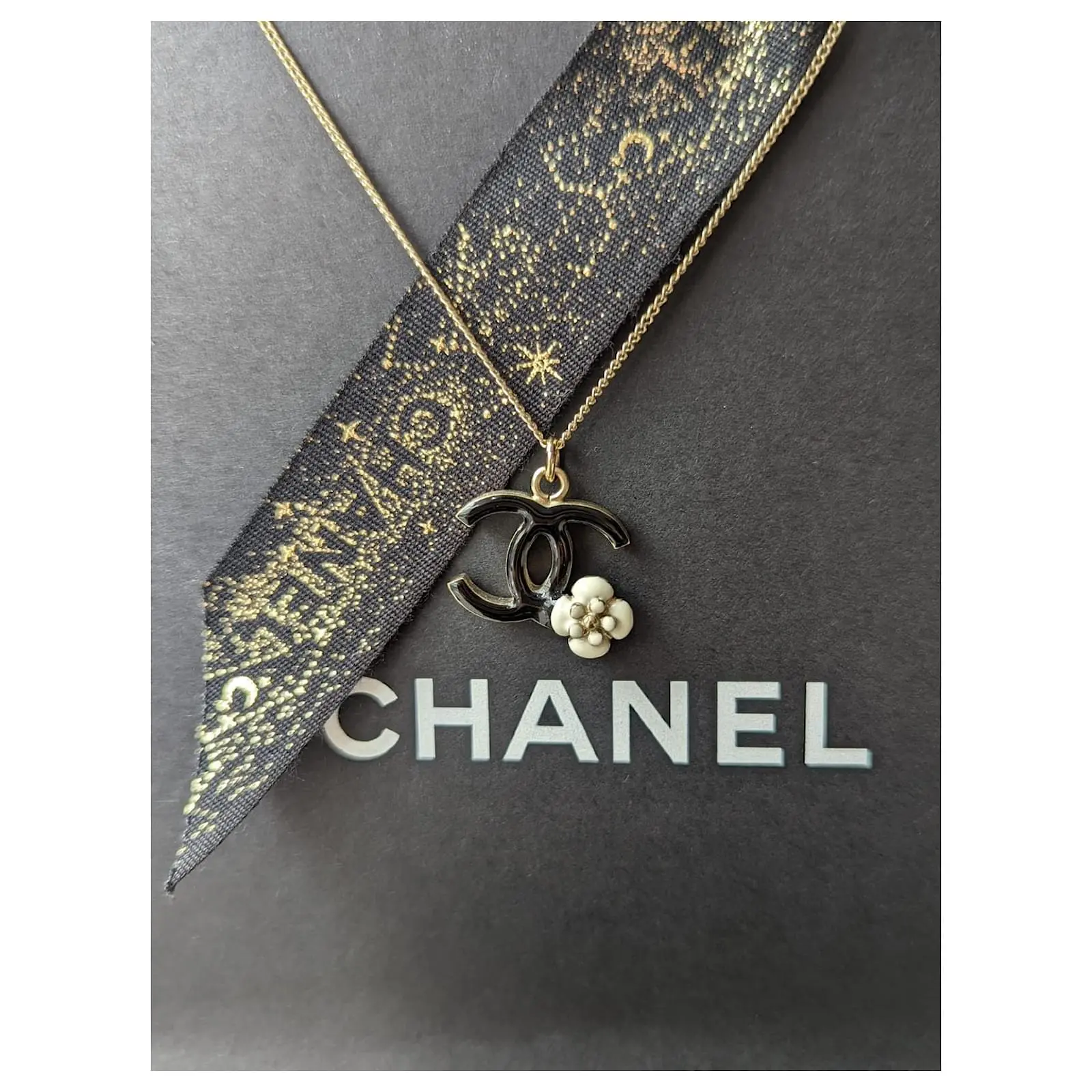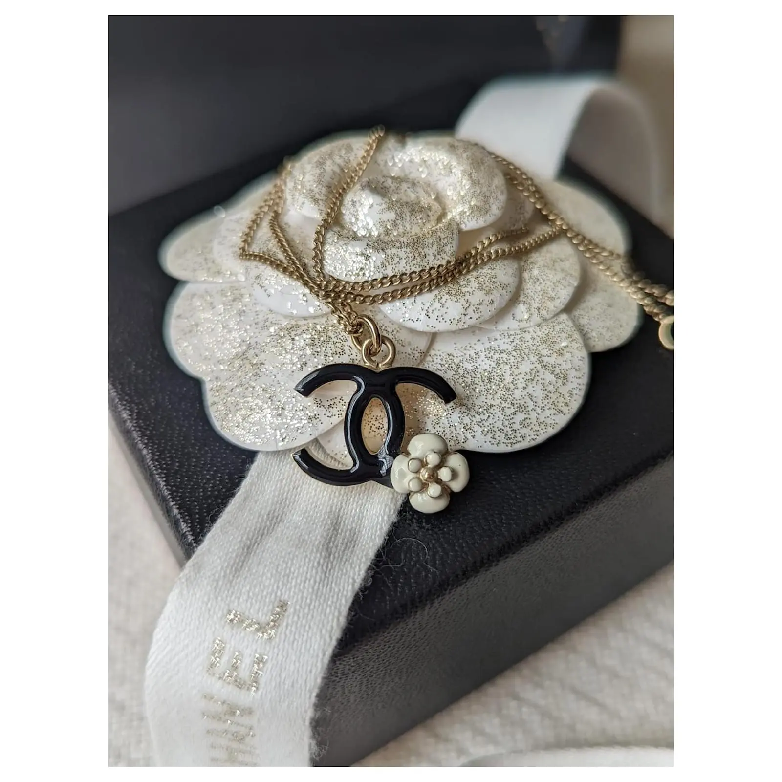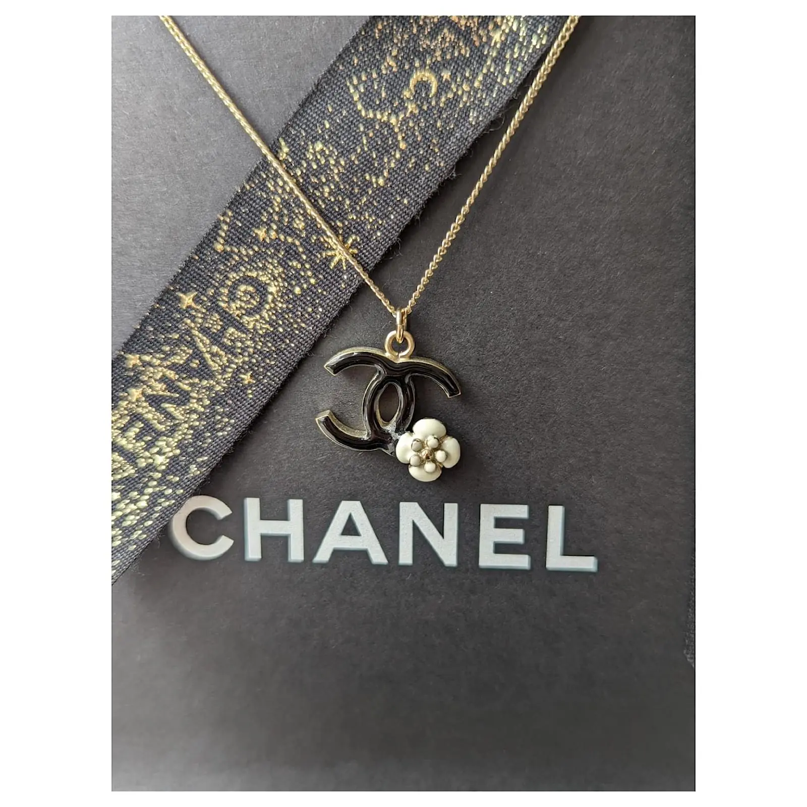 Chanel CC 08Un Collier GHW Logo Camellia En émail Noir Avec Boîte Doré