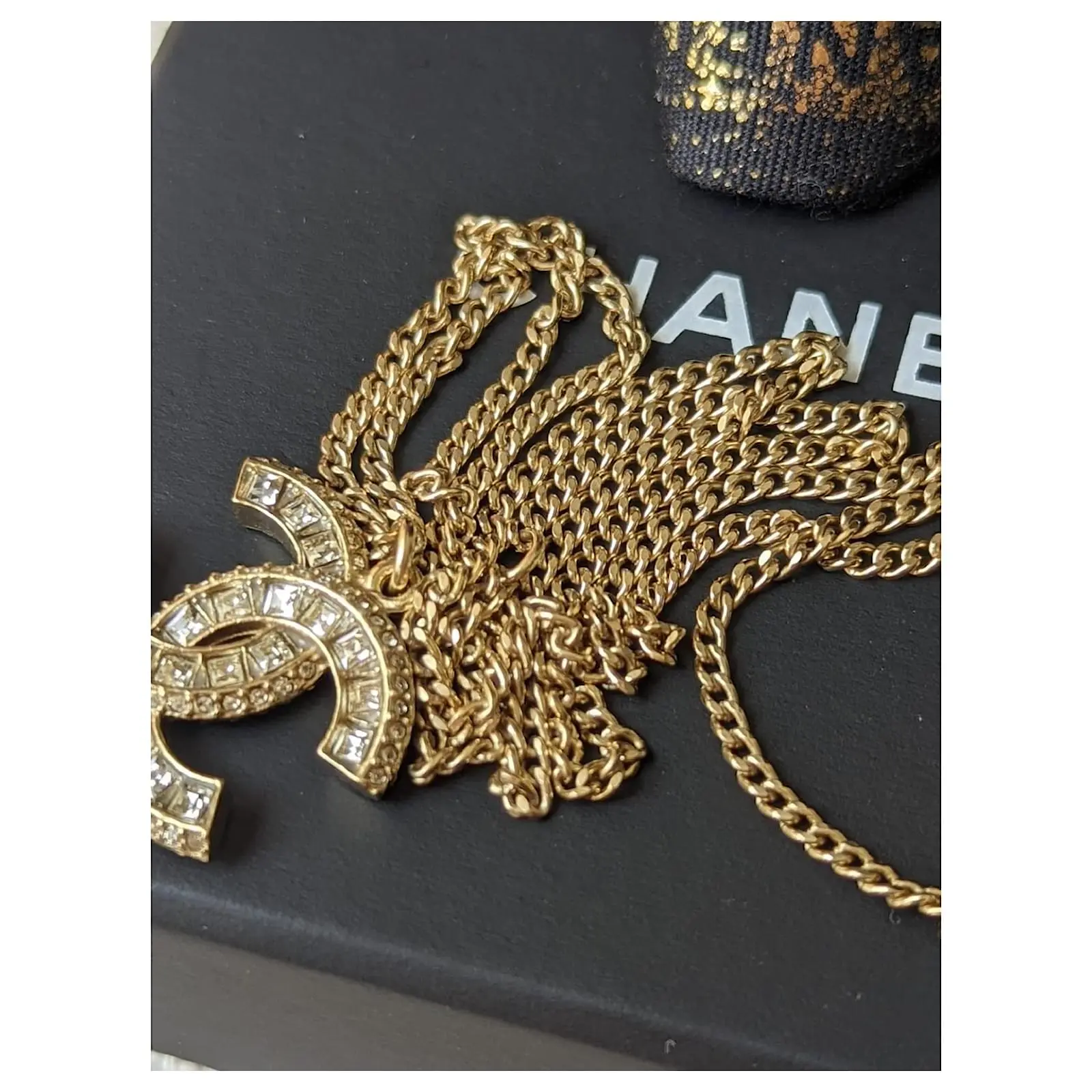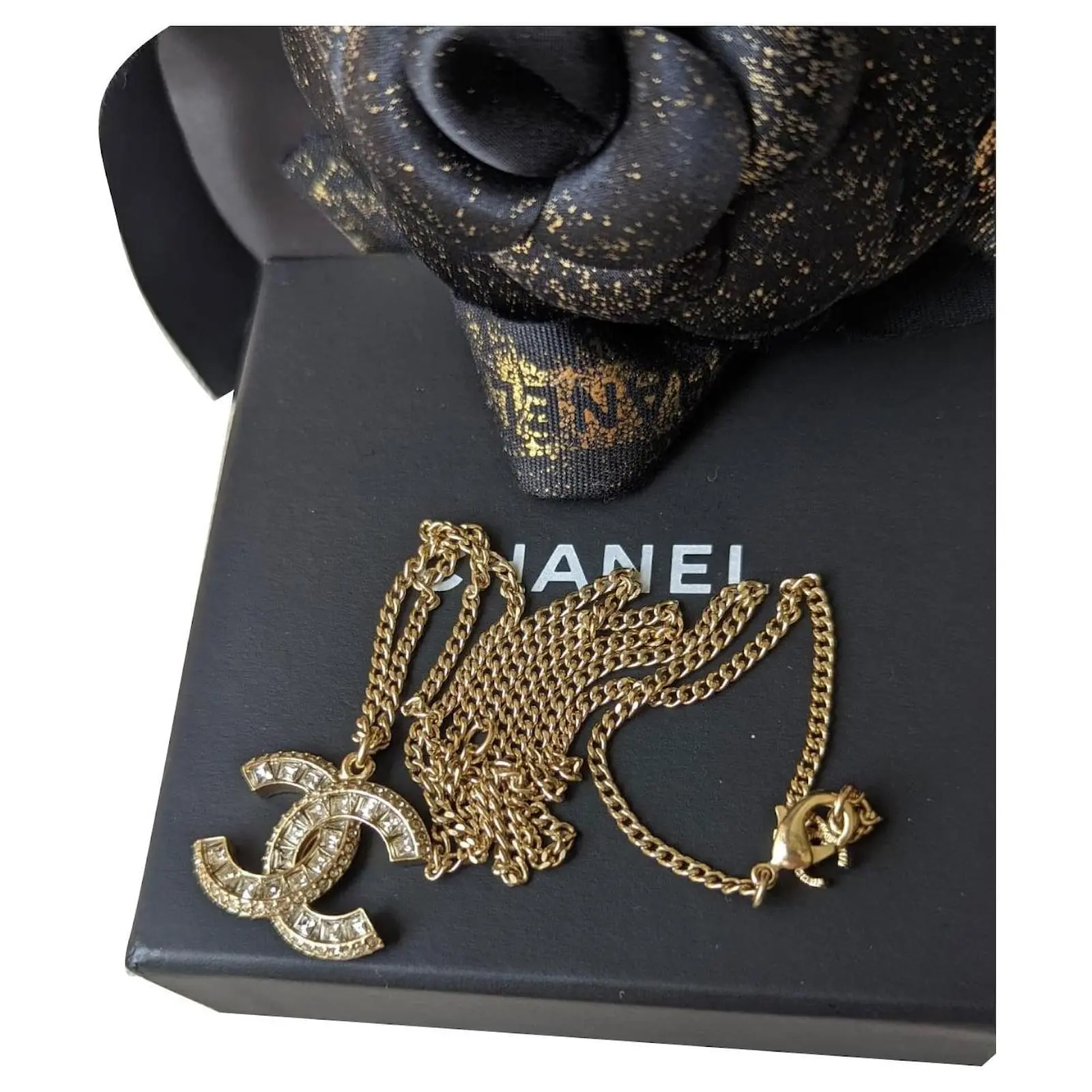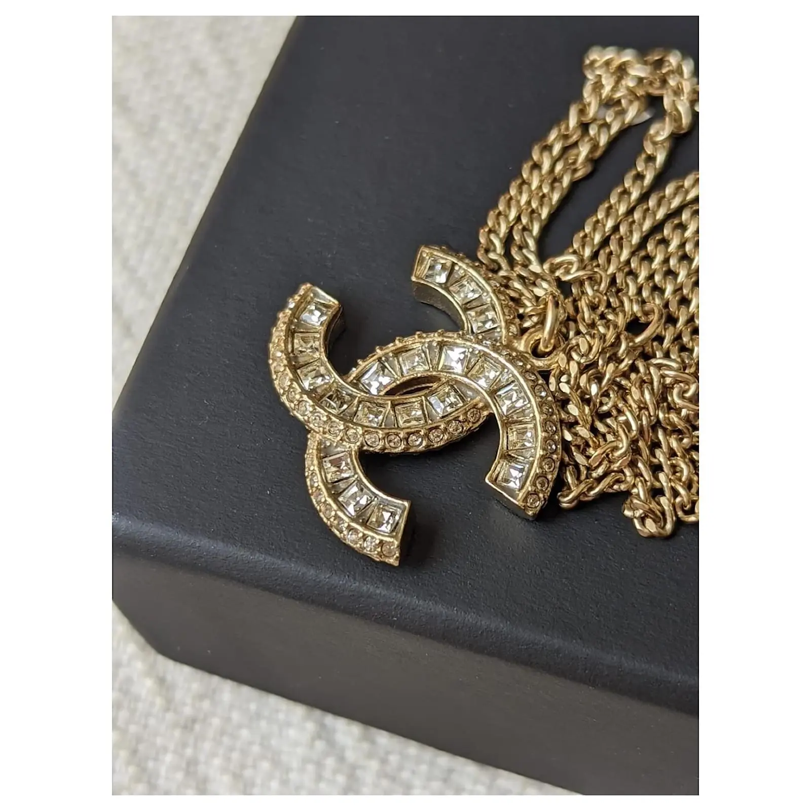 100% authentique collier en cristal avec logo Chanel CC dans un ton matériel doré champagne.