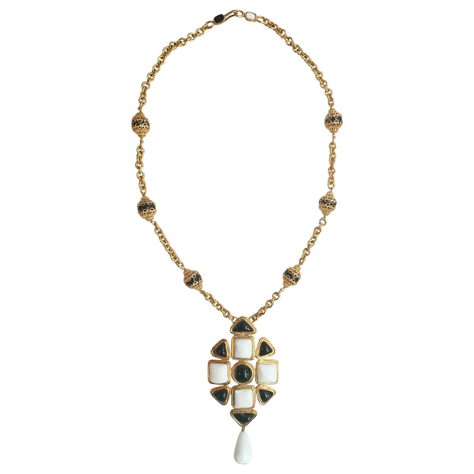 Emblématique des parures Chanel, exceptionnel sautoir avec grande croix en métal doré émaillée dans sa version noir et blanc, perles serties de métal doré ciselé.
