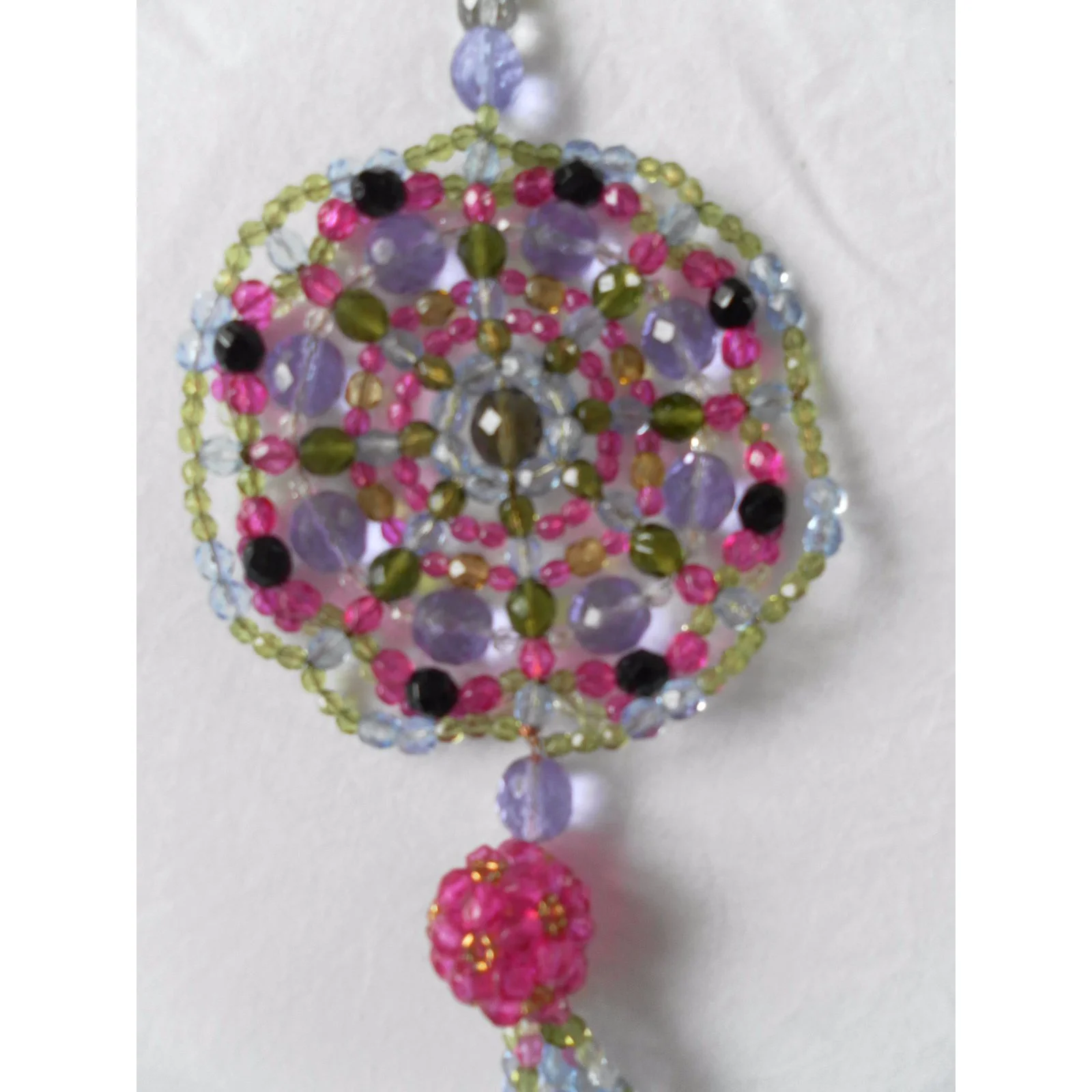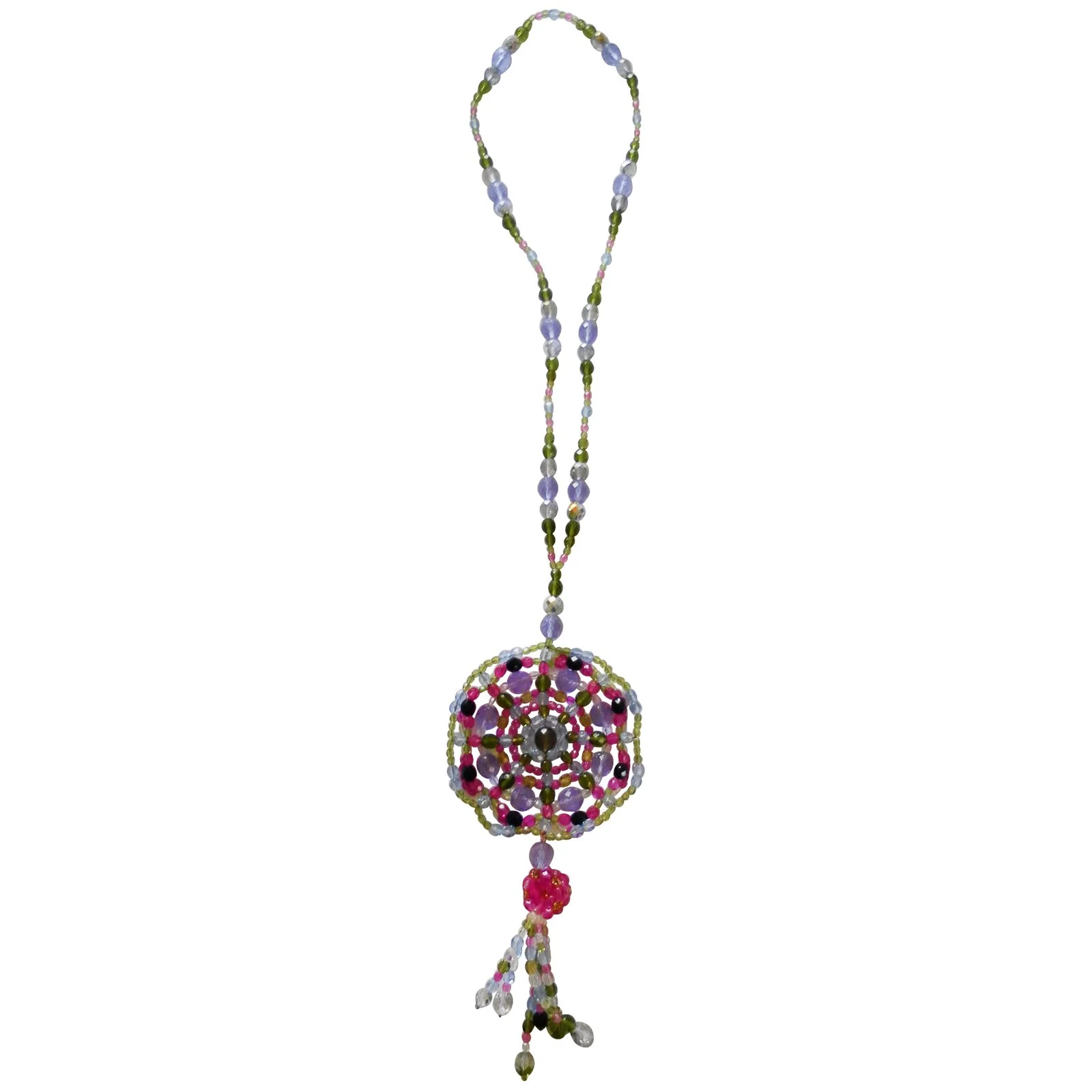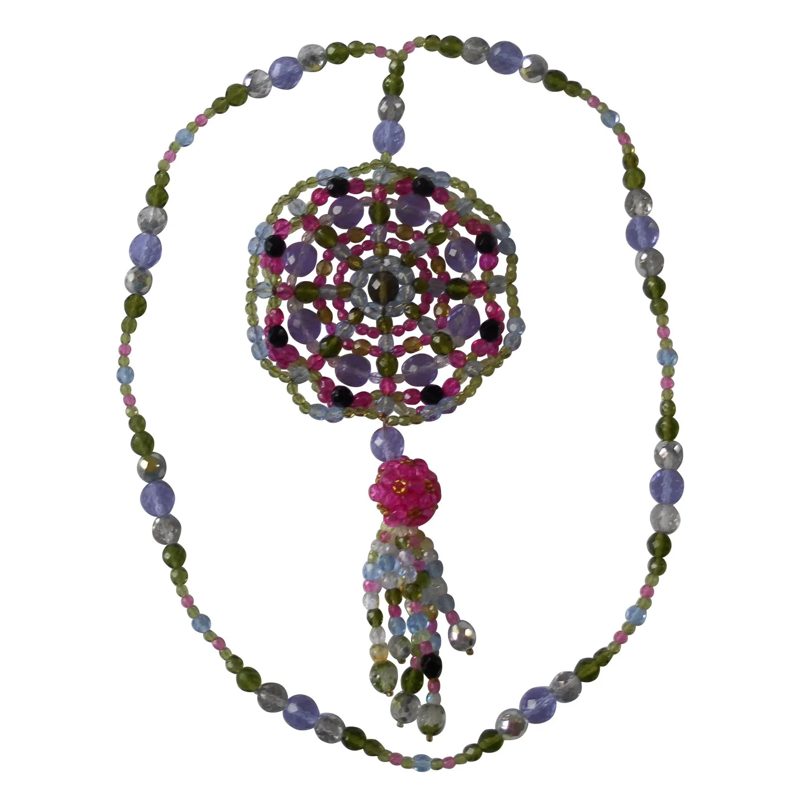 Sautoir de perles de verre, plaquĂ©es multicouleur. Le pendentif est de la forme dâun attrapeur de rĂȘves. Deux perles ont perdu la couleur est sont restĂ©es en verre transparent (voir le photo du dĂ©tail). Remis avec sa boite originale. La queue du pendentif Ă Ă©tĂ© rĂ©parĂ©e par Emilio Pucci, Ă travers la boutique oĂč j’ai achetĂ© le collier.