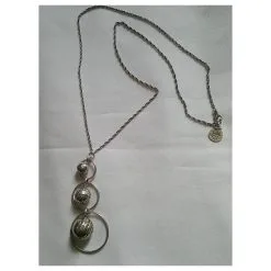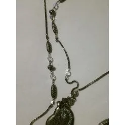 Collier Love, double cœur Longueur 2×47 cm. Ajustable, portable des différentes manières (un cœur derrière, un devant ou les deux devant, avec boucles d’oreilles assorties (longueur totale 2,5 cm). Bon état général, juste usure sur le devant du grand cœur à signaler.