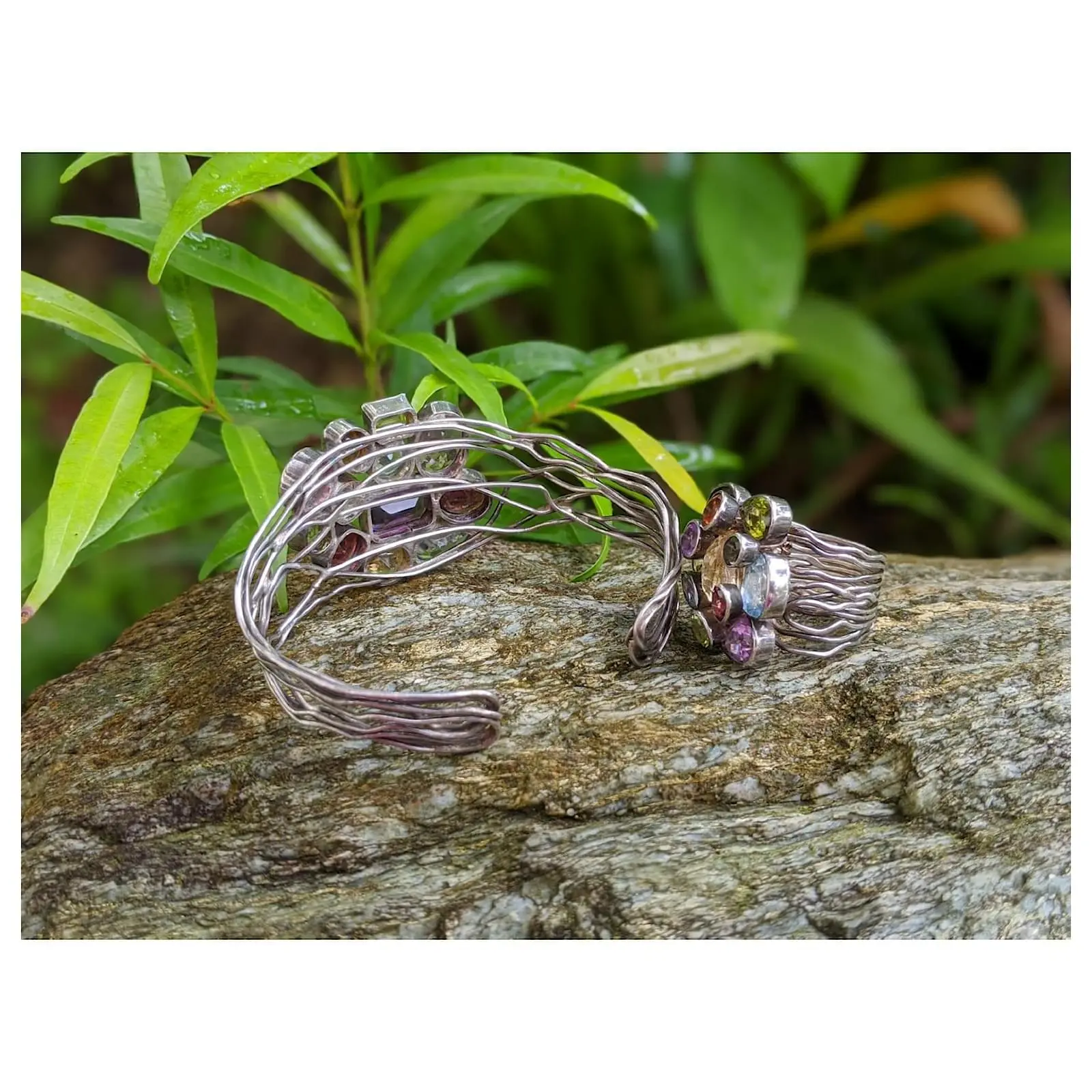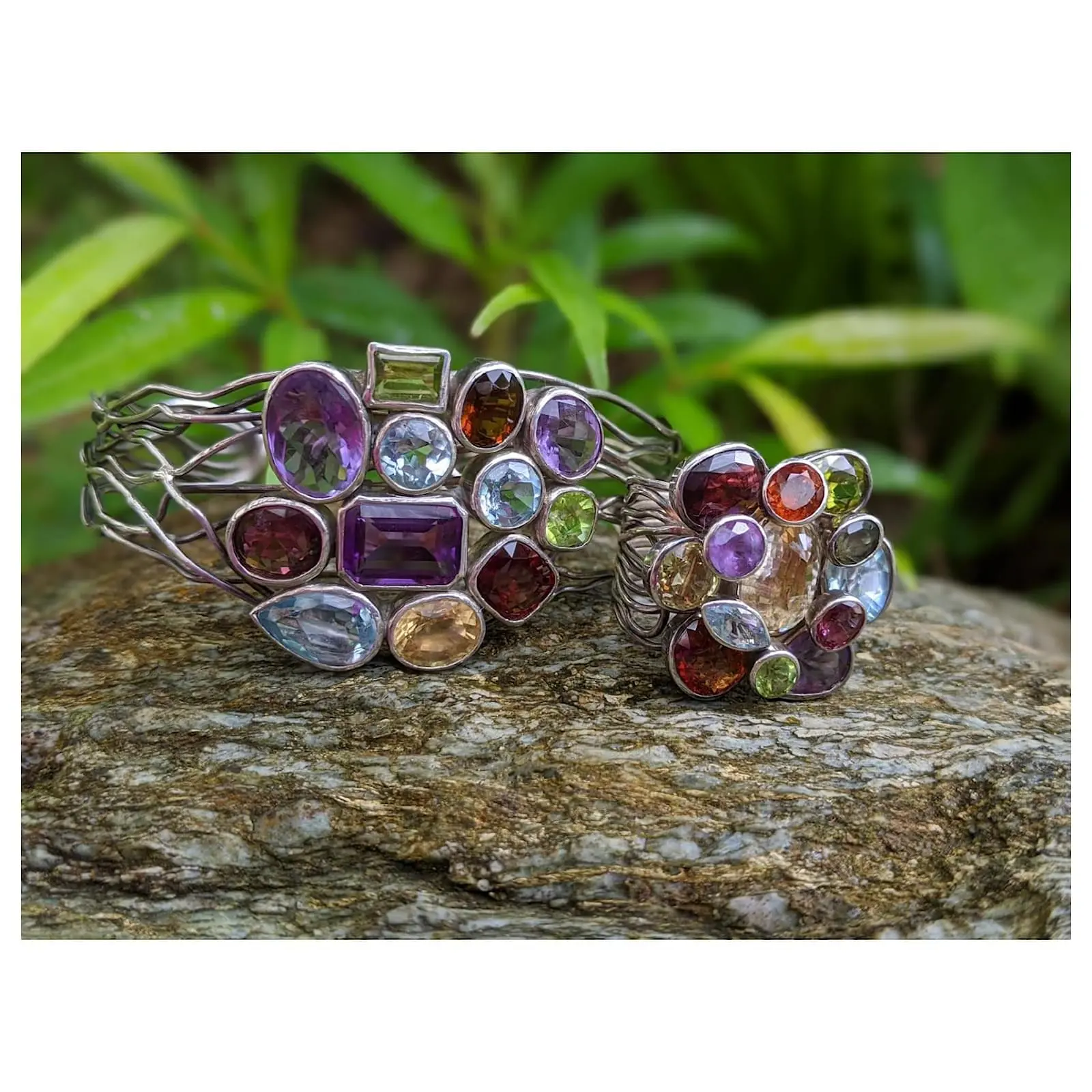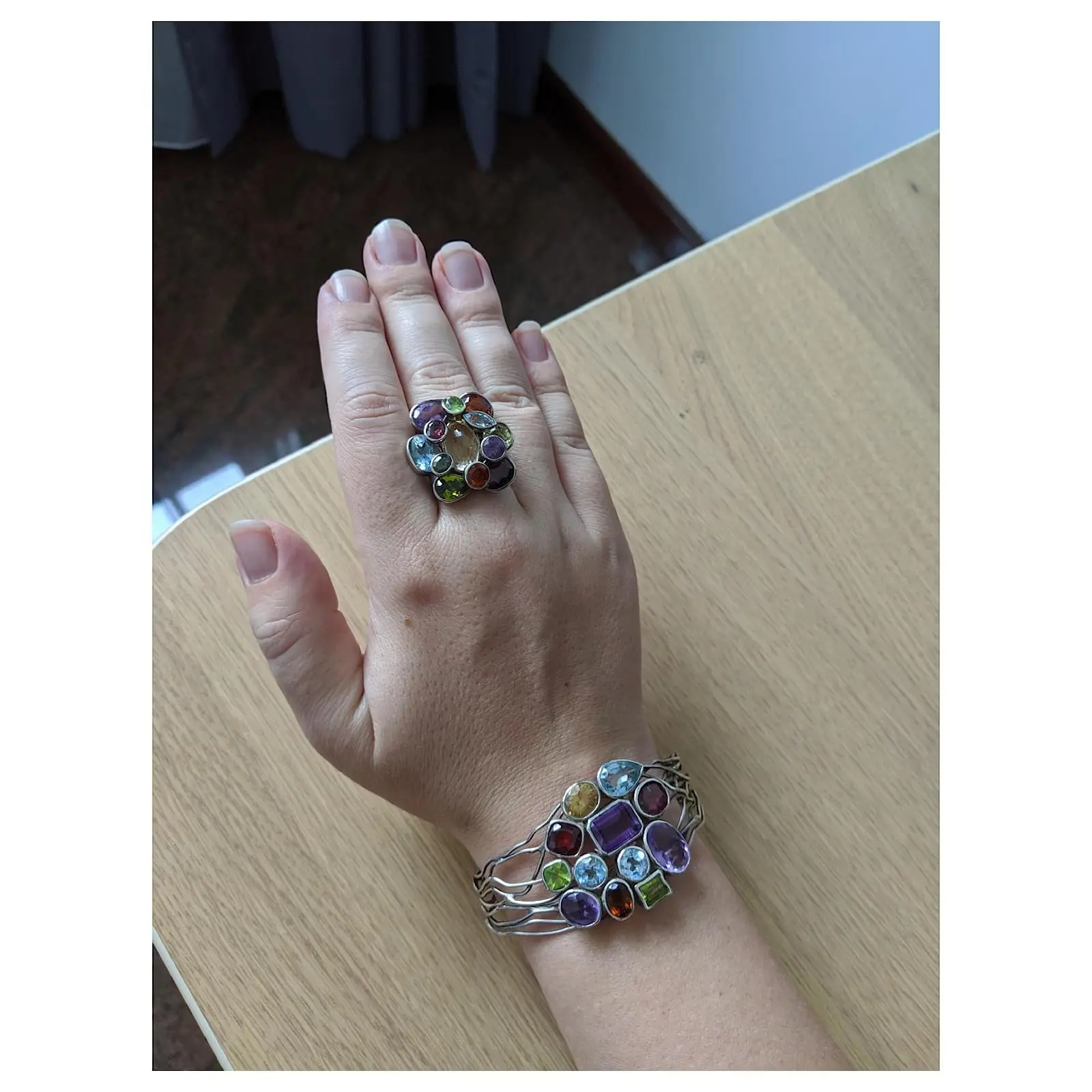 Joli ensemble bracelet et bague en 925 argent sterling et pierres précieuses : topaze, Citrine, grenat, améthyste, etc. Les pierres et l’argent viennent du mien à Madagascar.