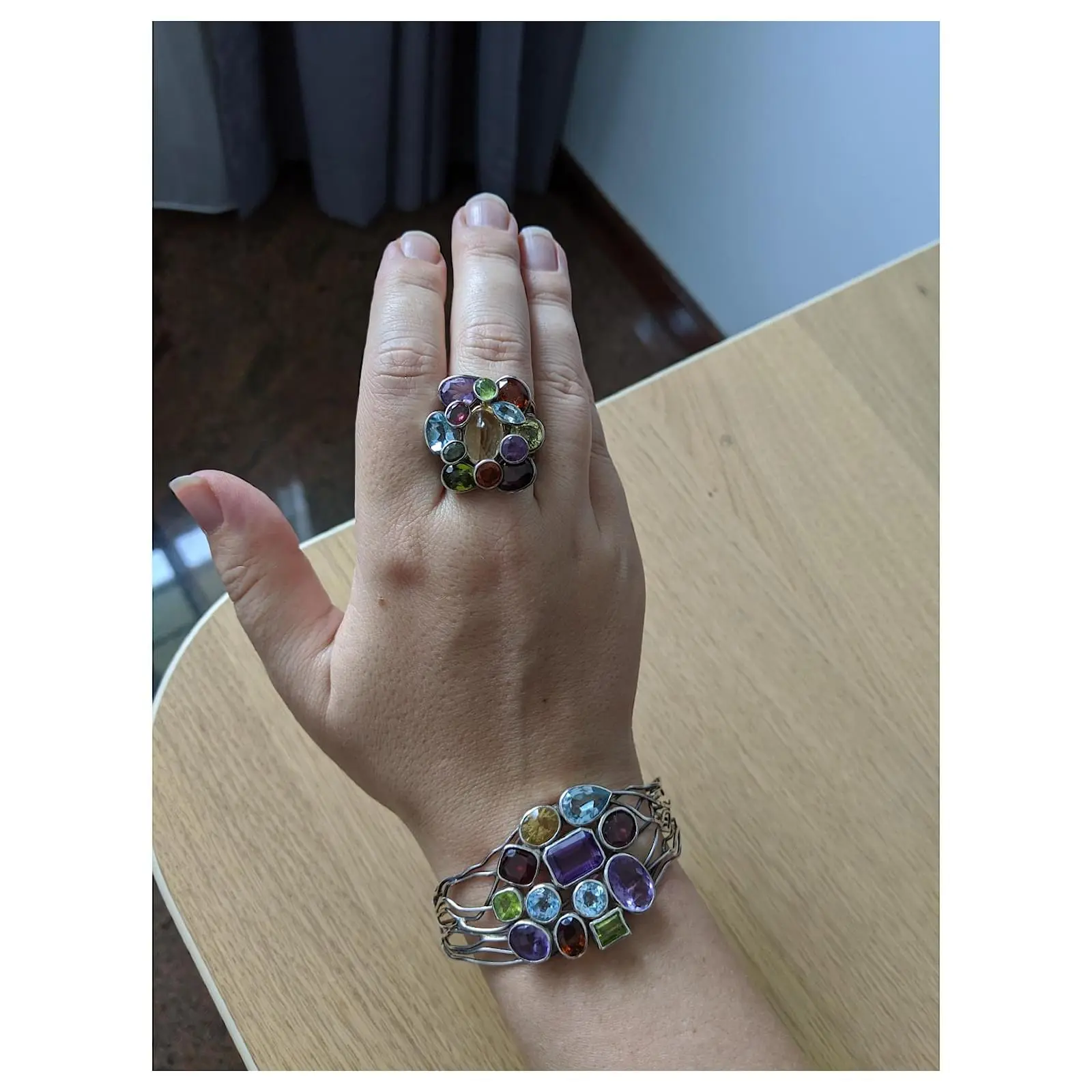 No Brand Argent Sterling 925 Ensemble Bracelet Et Bague Pierres Précieuses Améthyste Topaze Grenat Multicolore