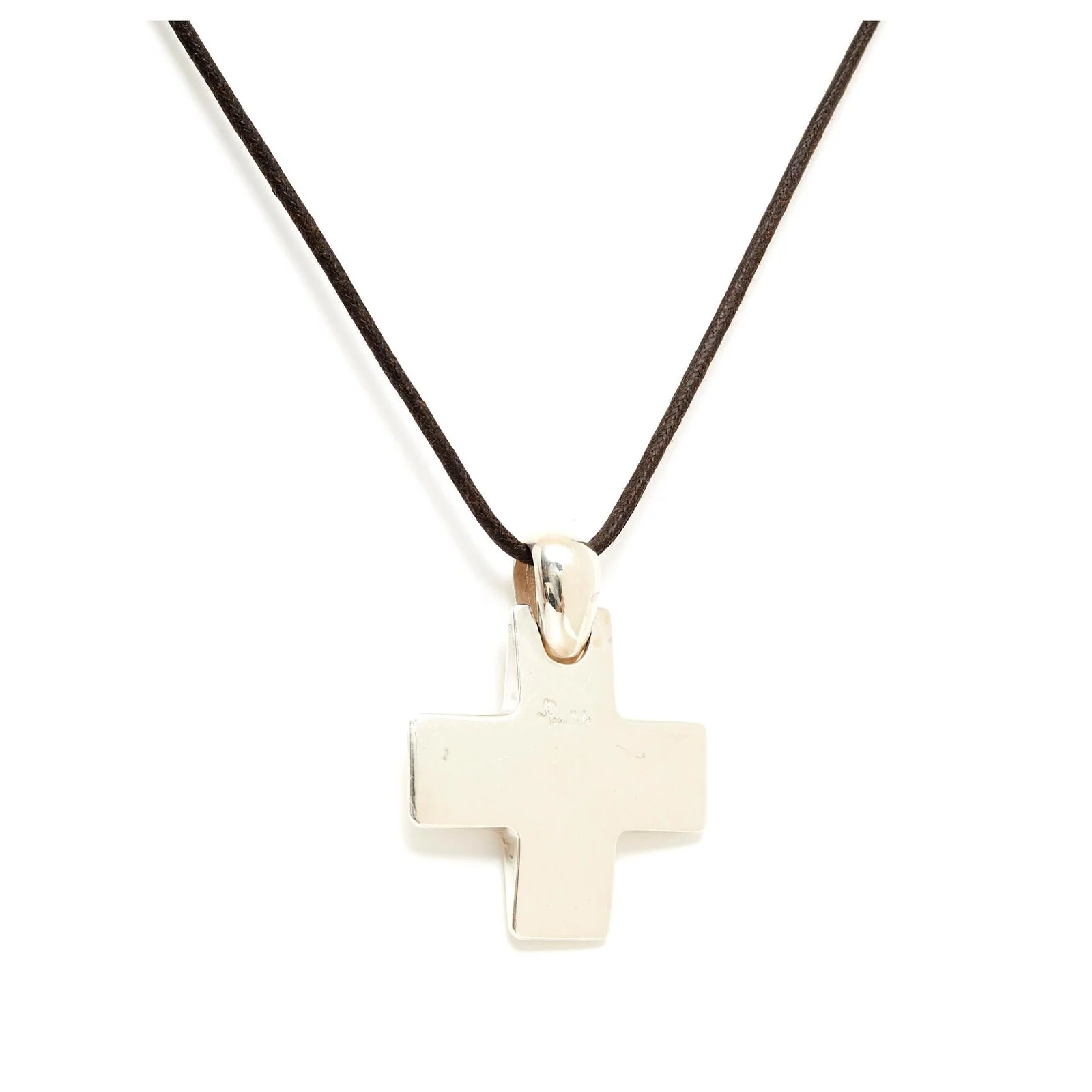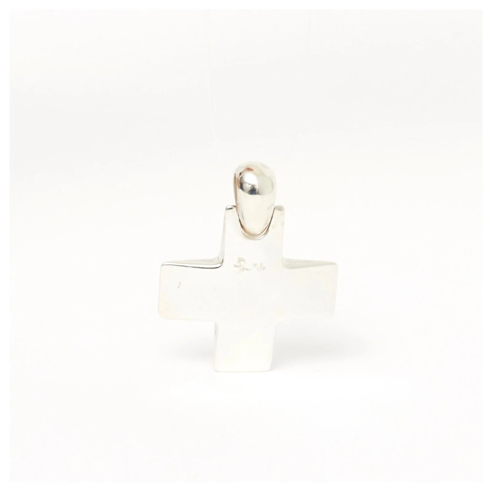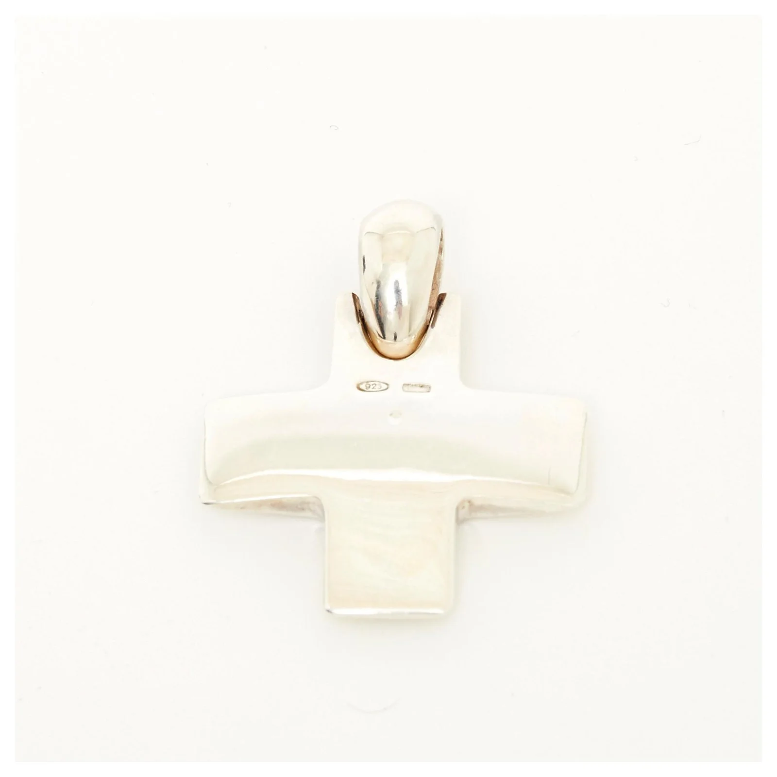 Croix Pomellato ligne 67 format XXL en argent massif signée Pomellato, livrée sur un cordon (non d’origine) dans sa pochette Pomellato 67. Largeur 3,85 cm x hauteur (avec la bélière) 4,8 cm, poids 36,11 gr. La croix présente quelques rayures mais elle est en très bon état.