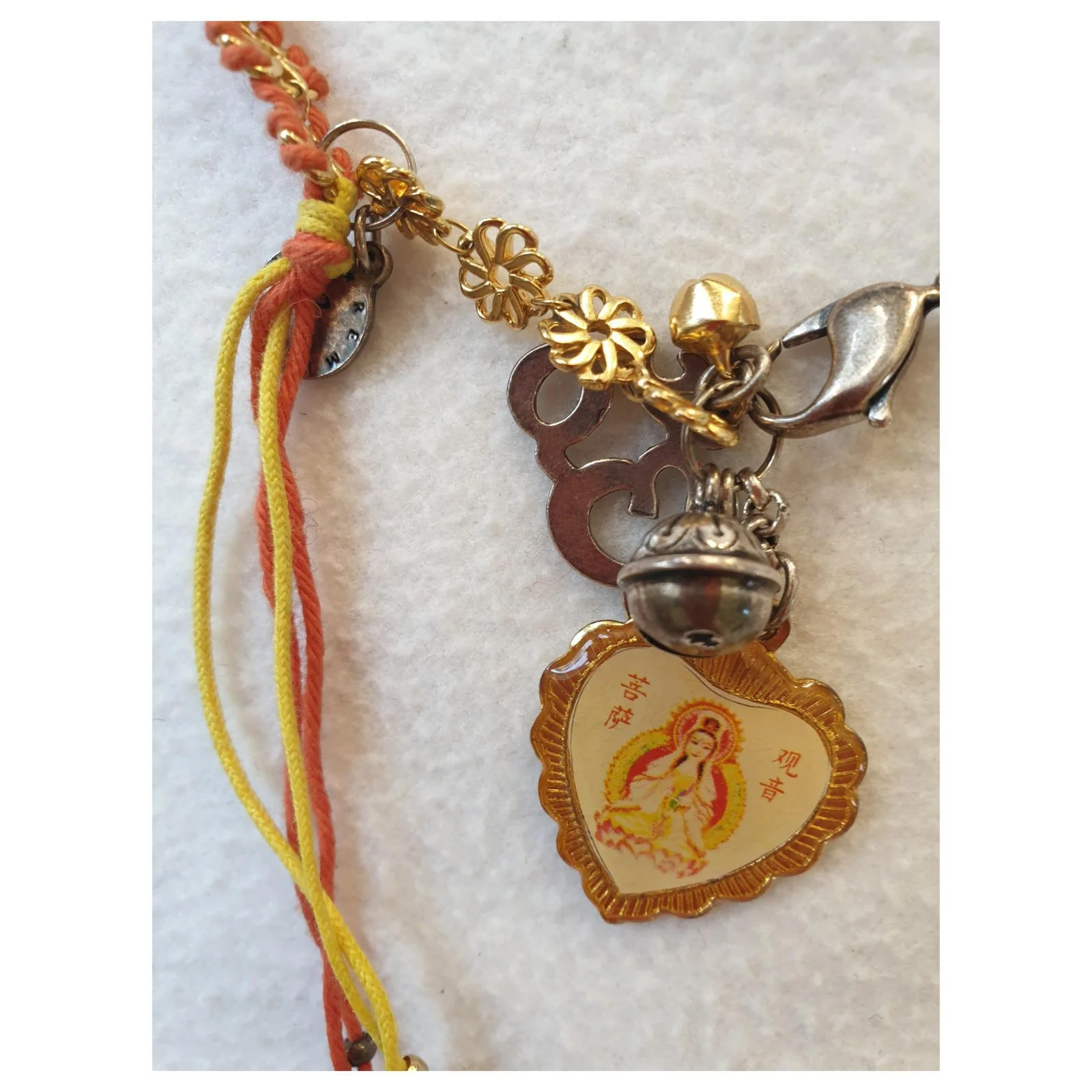 Collier et bracelet en métal réminiscence en or Daisy chain avec fil orange. Breloque émail en forme de coeur et cloches. Collier 44cm Longueur du bracelet 5.5 dans