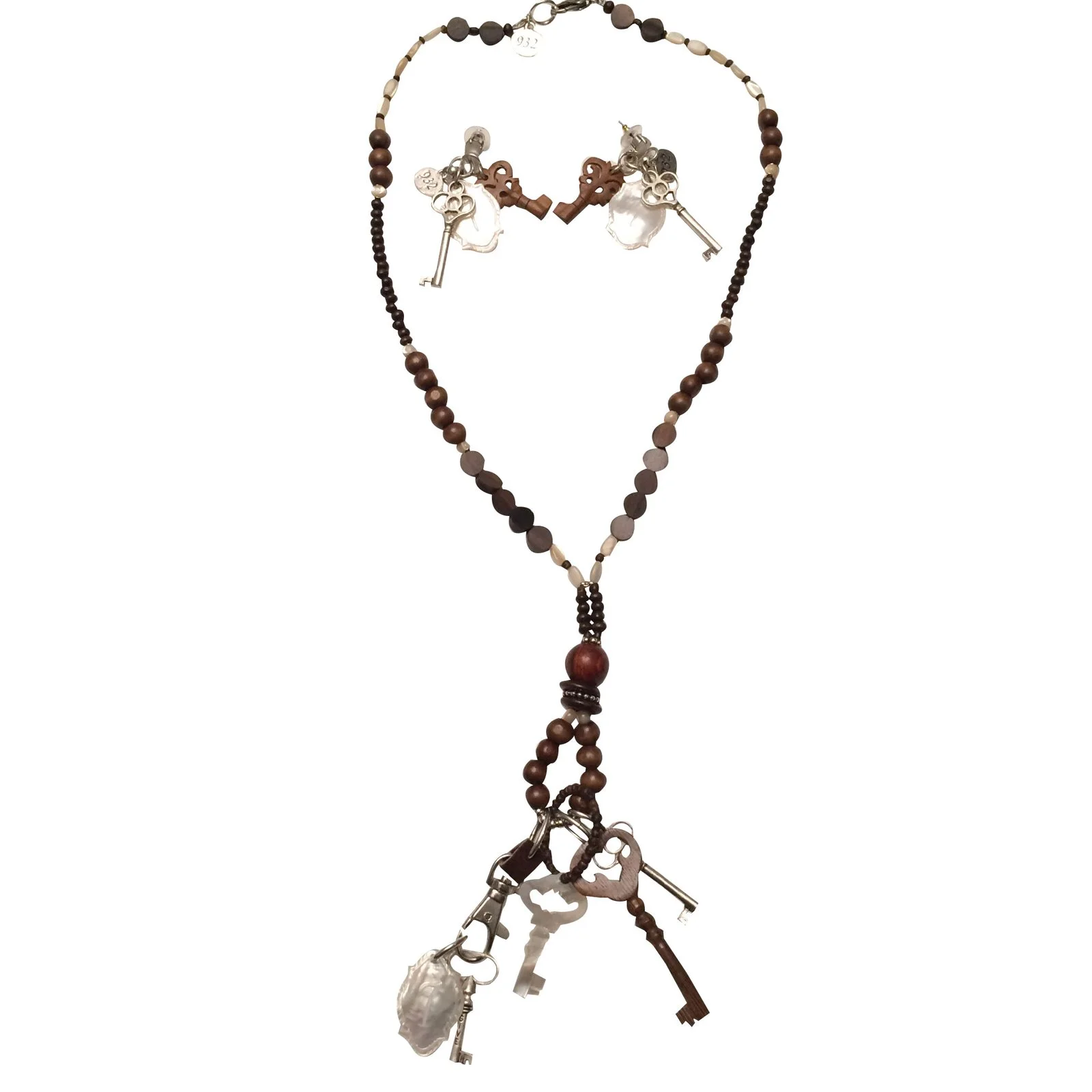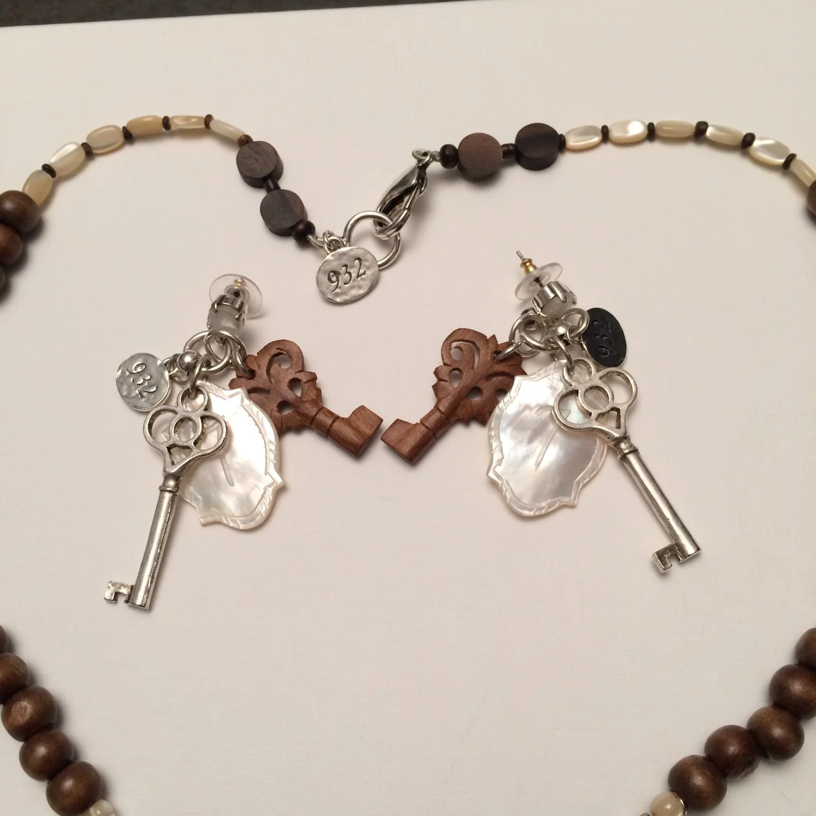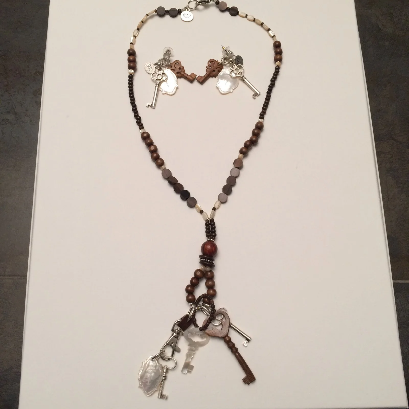 Parure REMINISCENCE sautoir & boucles d’oreille en bois et nacre, longueur collier à plat 51 cm (tour de cou 68 cm, pendentif 19 cm), longueur boucles 7 cm, sans défauts