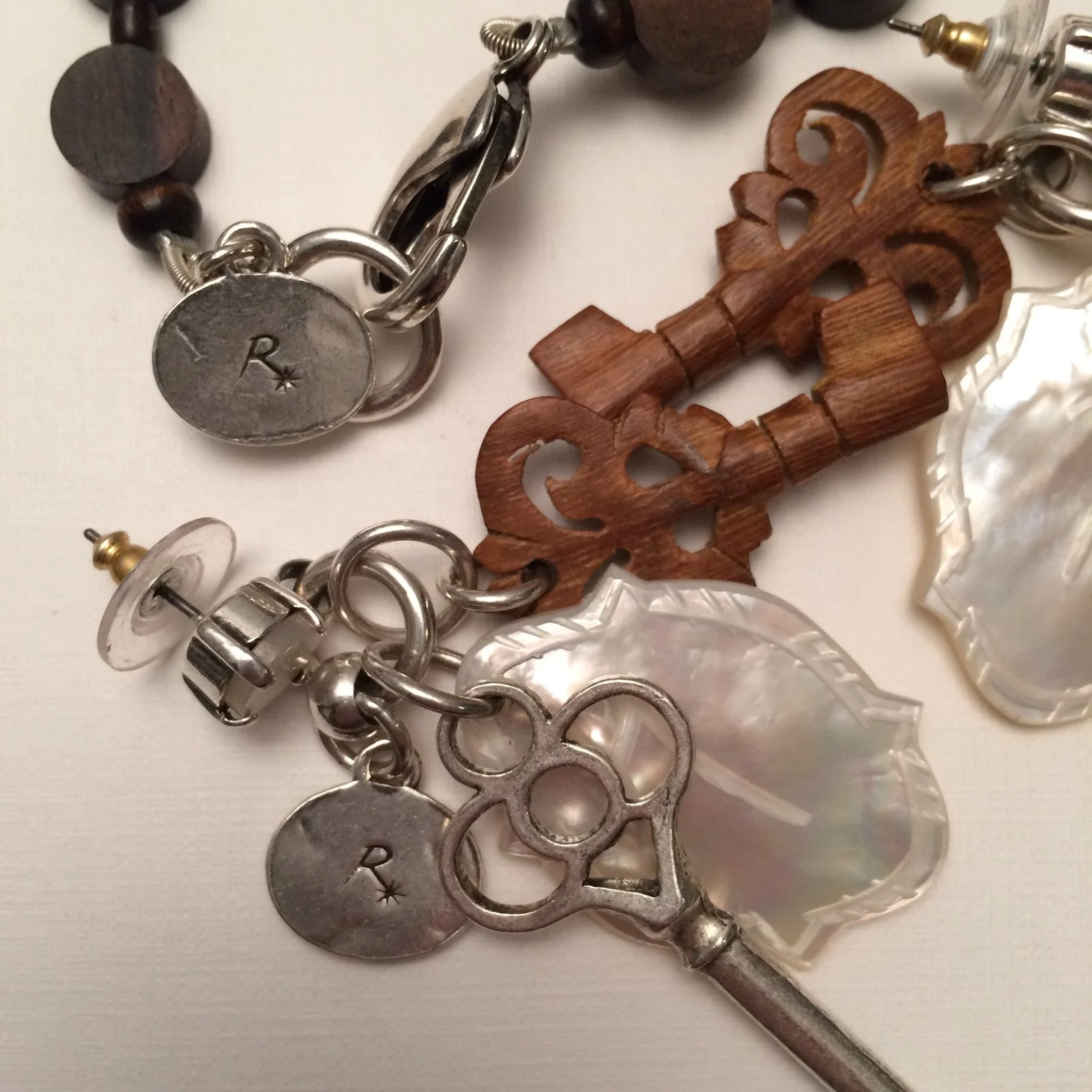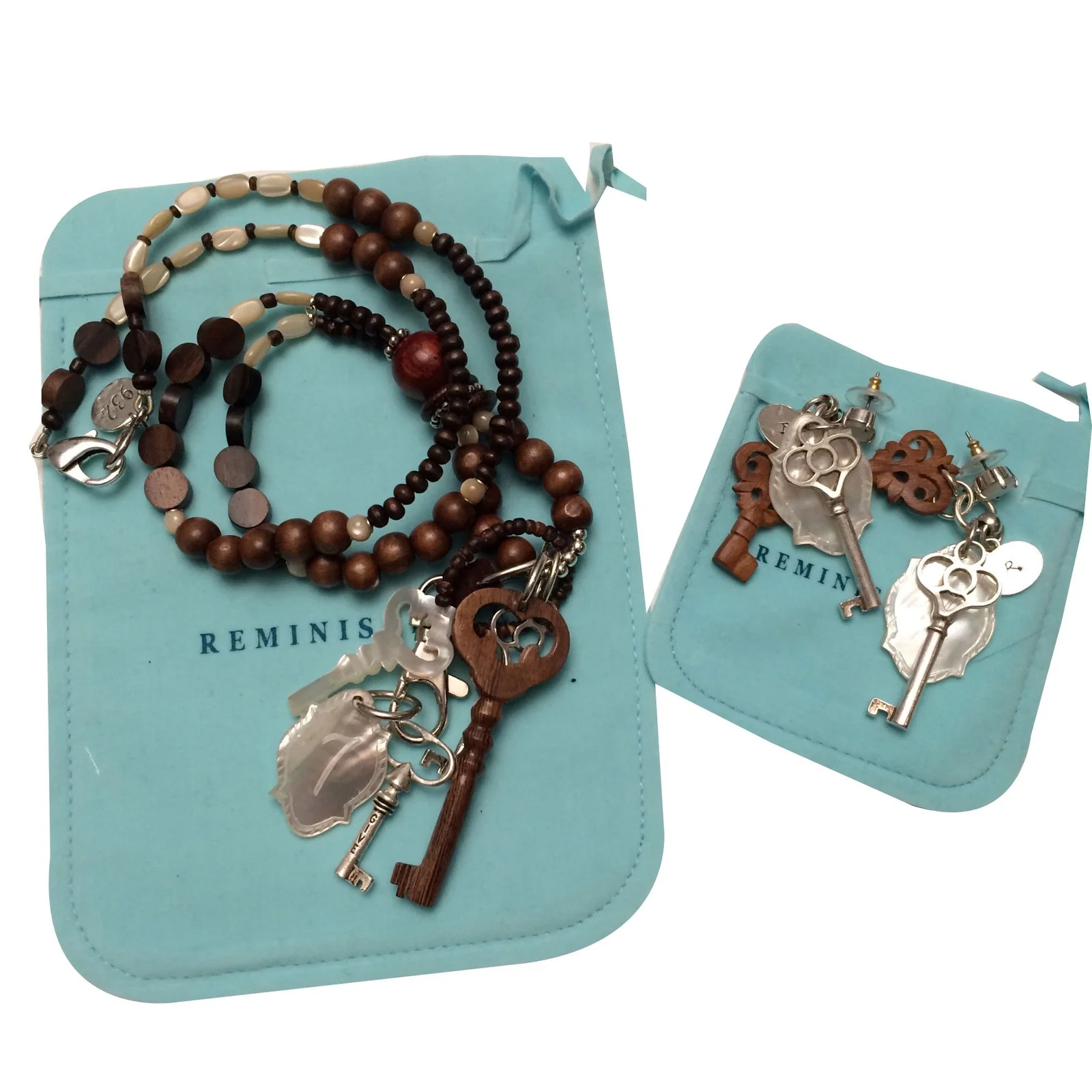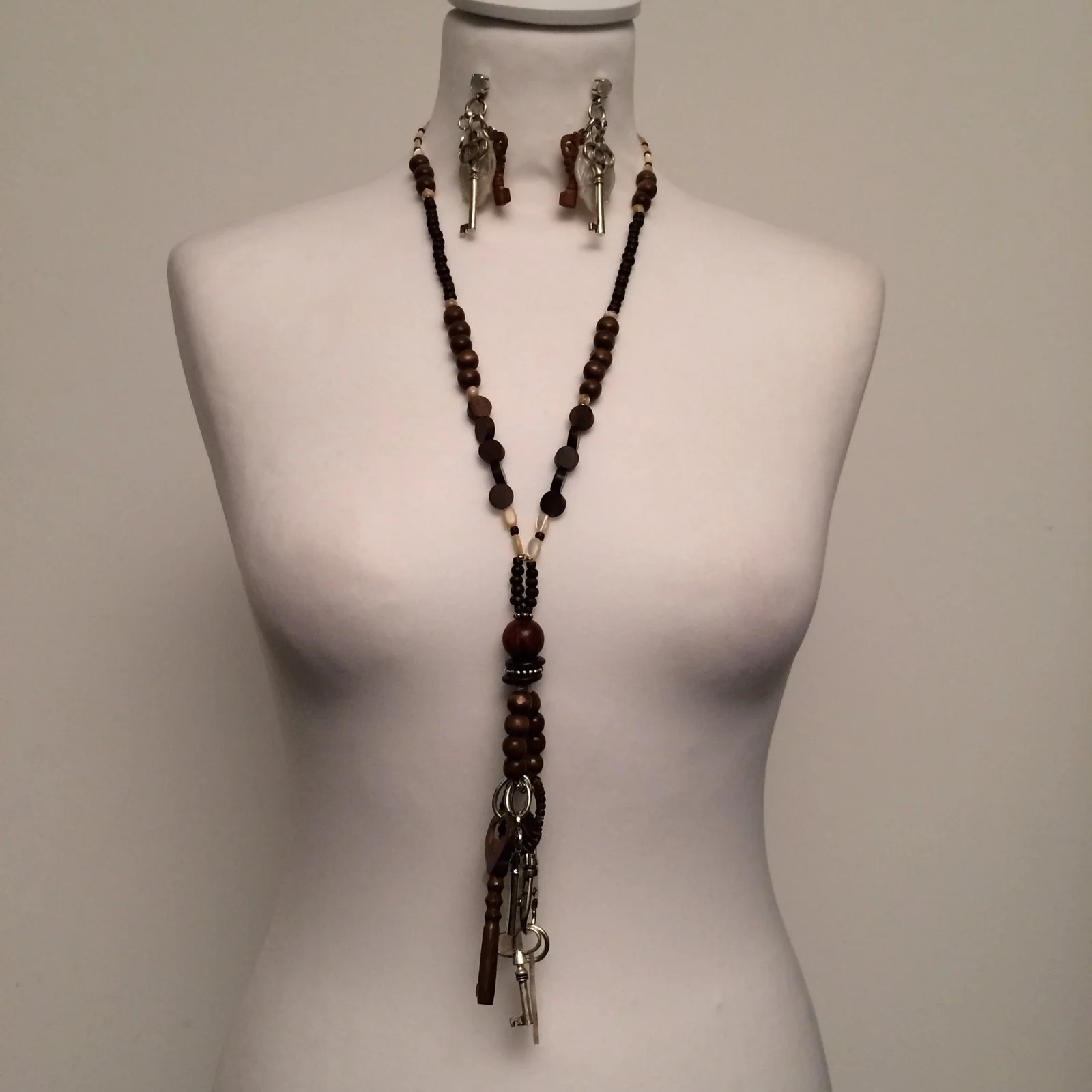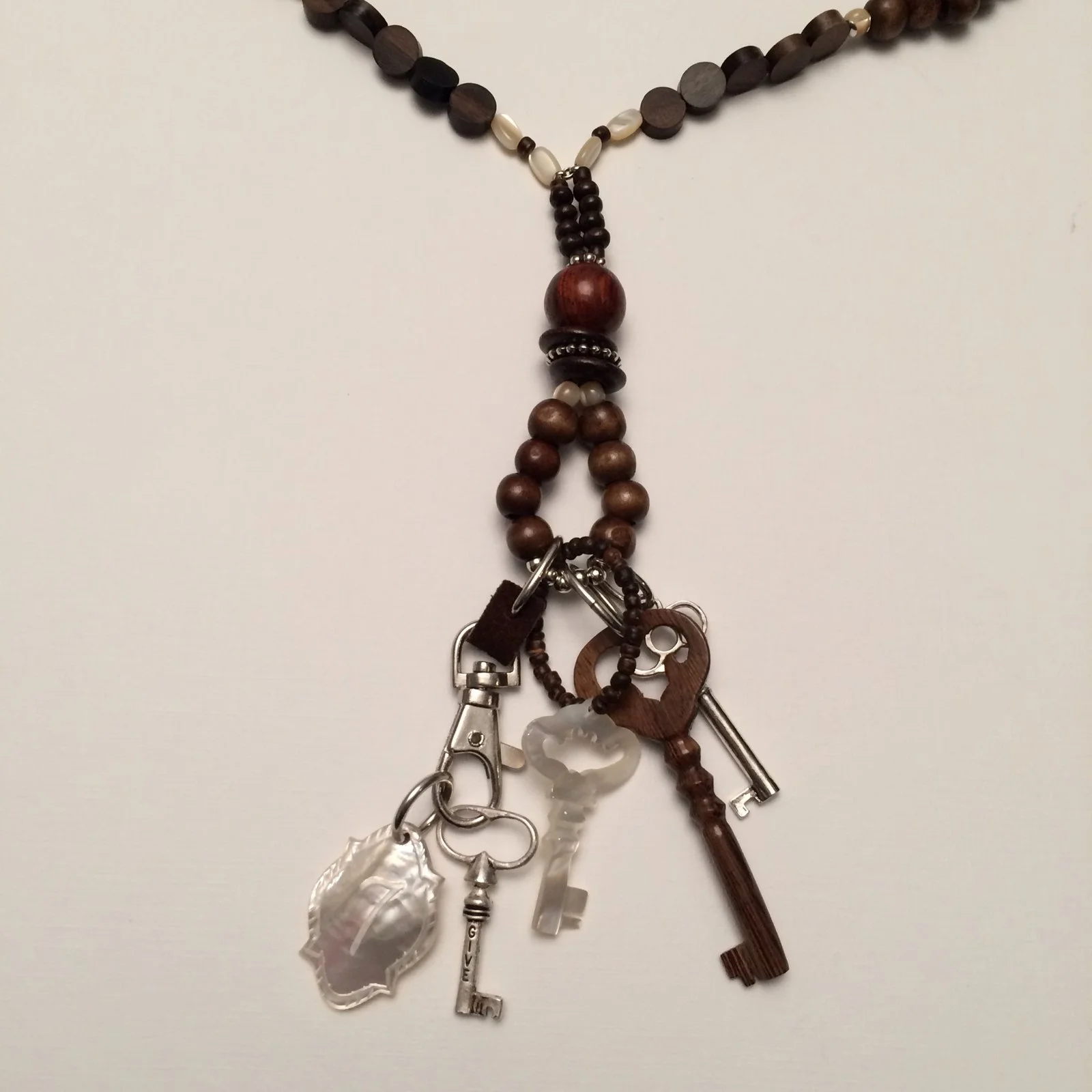 Parure REMINISCENCE sautoir & boucles d’oreille en bois et nacre, longueur collier à plat 51 cm (tour de cou 68 cm, pendentif 19 cm), longueur boucles 7 cm, sans défauts
