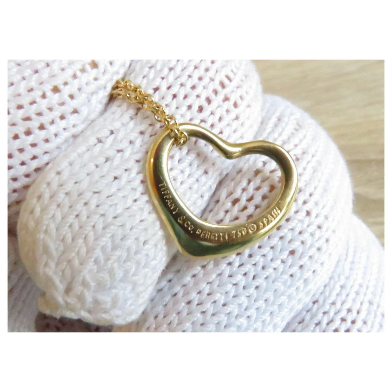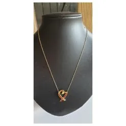 Très beau collier Tiffany & Co Elsa Peretti en or 18K 750. Longueur totale de la chaine : 41 cm. Dimensions du pendentif : 14 X 7 mm environ. Poinçon 750 sur fermoir et sur pendentif. Très bel état général, micro rayures visibles avec une loupe.