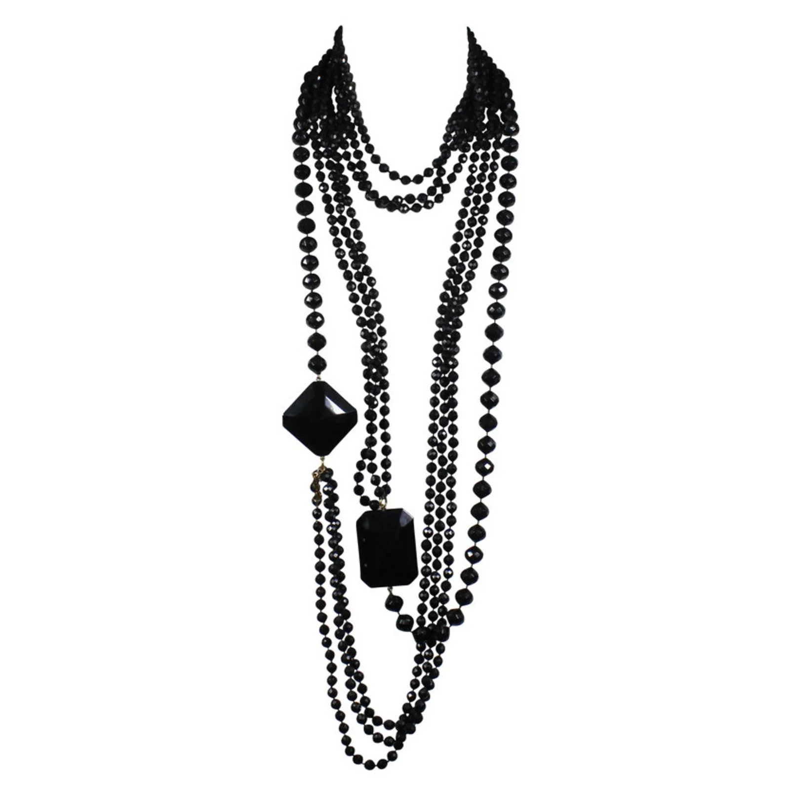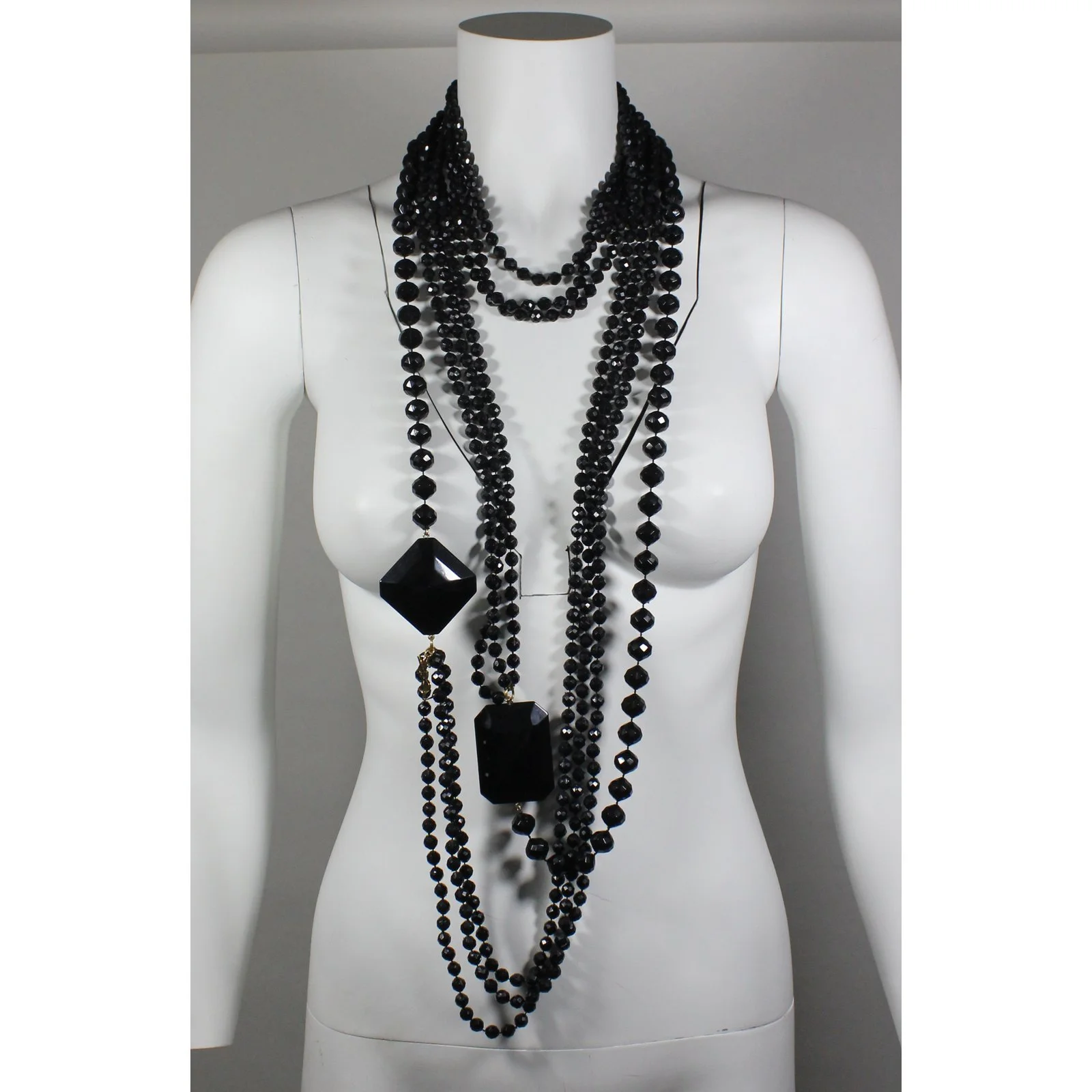 TrÚs beau sautoir multi-rangs de perles noires facetées Yves Saint Laurent. Il se compose de perles de deux tailles différentes et éléments carrés et rectangulaires facetés avec un pendentif logo doré. Longueur totale environ 1,45 m. En trÚs bon état.